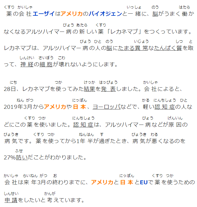 28日、レカネマブを使ってみた結果を発表しました。会社によると、2019年3月からアメリカや日本、ヨーロッパなどで、軽い認知症の人などにこの薬を使いました。認知症は、アルツハイマー病などが原因の病気です。薬を使ってから1年半が過ぎたとき、病気が悪くなるのを27%防いだことがわかりました。