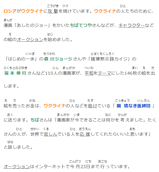 ロシアがウクライナに攻撃を続けています。ウクライナの人たちのために、漫画「あしたのジョー」をかいたちばてつやさんなどが、キャラクターなどの絵のオークションを始めました。