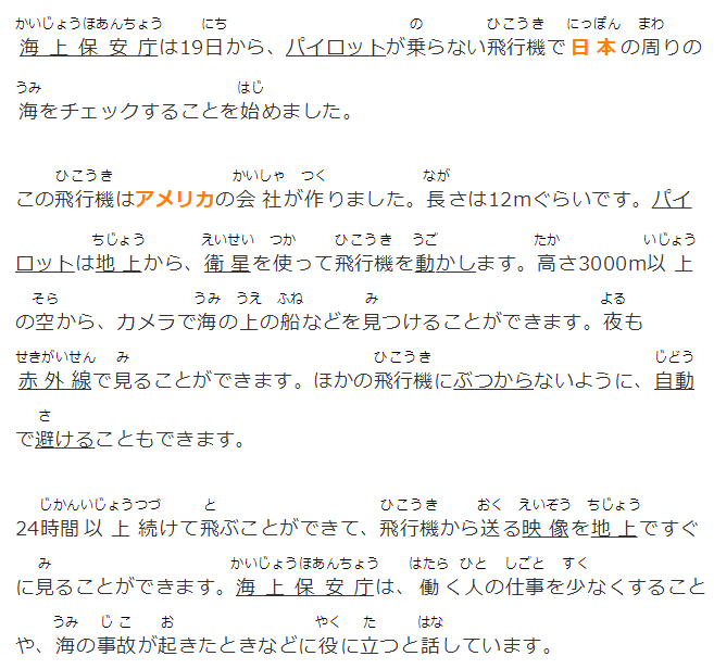 この飛行機はアメリカの会社が作りました。長さは12mぐらいです。パイロットは地上から、衛星を使って飛行機を動かします。高さ3000m以上の空から、カメラで海の上の船などを見つけることができます。夜も赤外線で見ることができます。ほかの飛行機にぶつからないように、自動で避けることもできます。