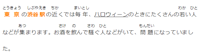 東京の渋谷駅の近くでは毎年、ハロウィーンのときにたくさんの若い人などが集まります。お酒を飲んで騒ぐ人などがいて、問題になっていました。