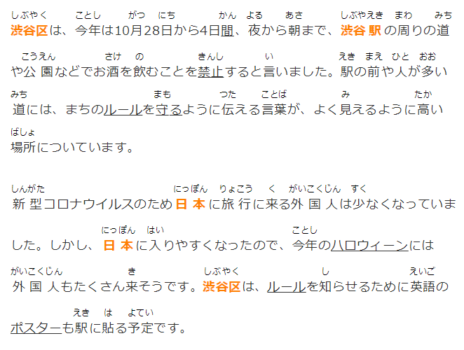 新型コロナウイルスのため日本に旅行に来る外国人は少なくなっていました。しかし、日本に入りやすくなったので、今年のハロウィーンには外国人もたくさん来そうです。渋谷区は、ルールを知らせるために英語のポスターも駅に貼る予定です。