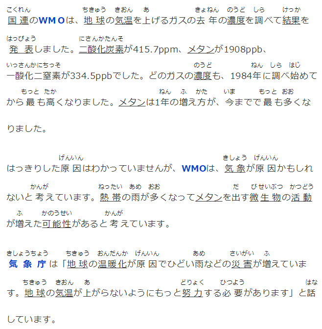 国連のWMOは、地球の気温を上げるガスの去年の濃度を調べて結果を発表しました。二酸化炭素が415.7ppm、メタンが1908ppb、一酸化二窒素が334.5ppbでした。どのガスの濃度も、1984年に調べ始めてから最も高くなりました。メタンは1年の増え方が、今までで最も多くなりました。
