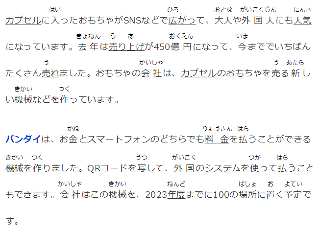 カプセルに入ったおもちゃがSNSなどで広がって、大人や外国人にも人気になっています。去年は売り上げが450億円になって、今まででいちばんたくさん売れました。おもちゃの会社は、カプセルのおもちゃを売る新しい機械などを作っています。