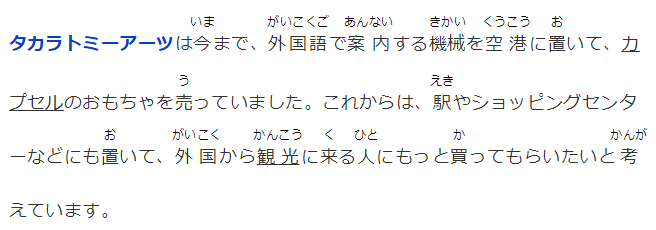 タカラトミーアーツは今まで、外国語で案内する機械を空港に置いて、カプセルのおもちゃを売っていました。これからは、駅やショッピングセンターなどにも置いて、外国から観光に来る人にもっと買ってもらいたいと考えています。