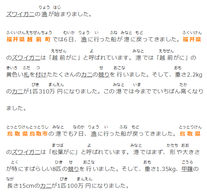 福井県越前町では6日、漁に行った船が港に戻ってきました。福井県のズワイガニは「越前がに」と呼ばれています。港では「越前がに」の黄色い札を付けたたくさんのカニの競りを行いました。そして、重さ2.2kgのカニが1匹310万円になりました。この港では今まででいちばん高くなりました。