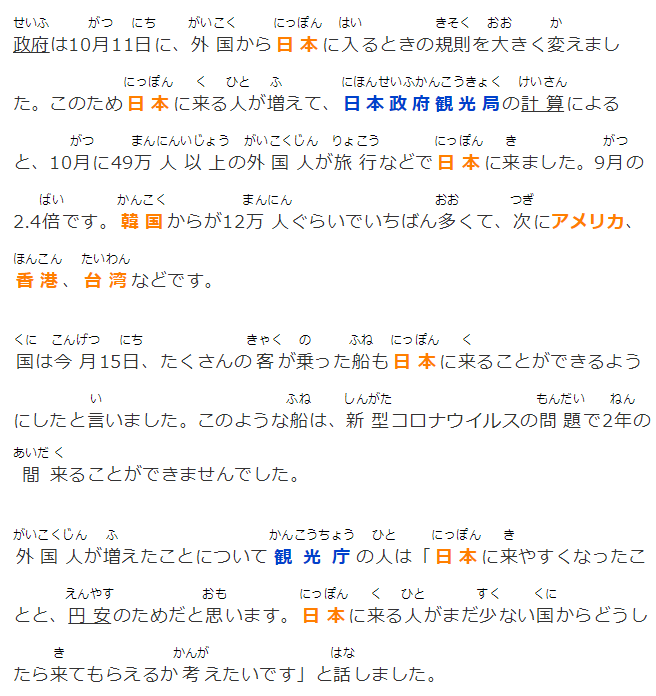政府は10月11日に、外国から日本に入るときの規則を大きく変えました。このため日本に来る人が増えて、日本政府観光局の計算によると、10月に49万人以上の外国人が旅行などで日本に来ました。9月の2.4倍です。韓国からが12万人ぐらいでいちばん多くて、次にアメリカ、香港、台湾などです。