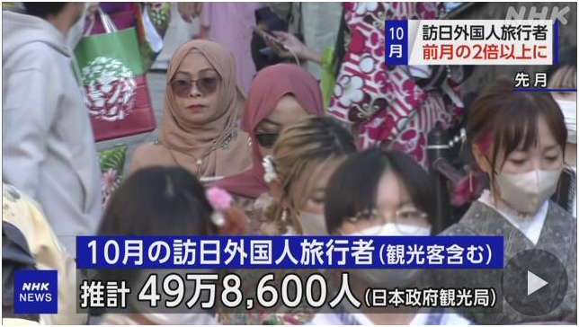 据日本政府观光局的统计显示,据估算,包括游客在内,10月来日的外国旅行者约为49万8600人。
