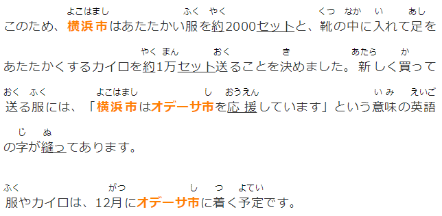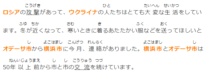 ロシアのこうげきがあって、ウクライナの人たちはとても大変な生活をしています。冬が近くなって、寒いときに着るあたたかい服などを送ってほしいとオデーサ市から横浜市に今月、連絡がありました。横浜市とオデーサ市は50年以上前から市と市の交流を続けています。