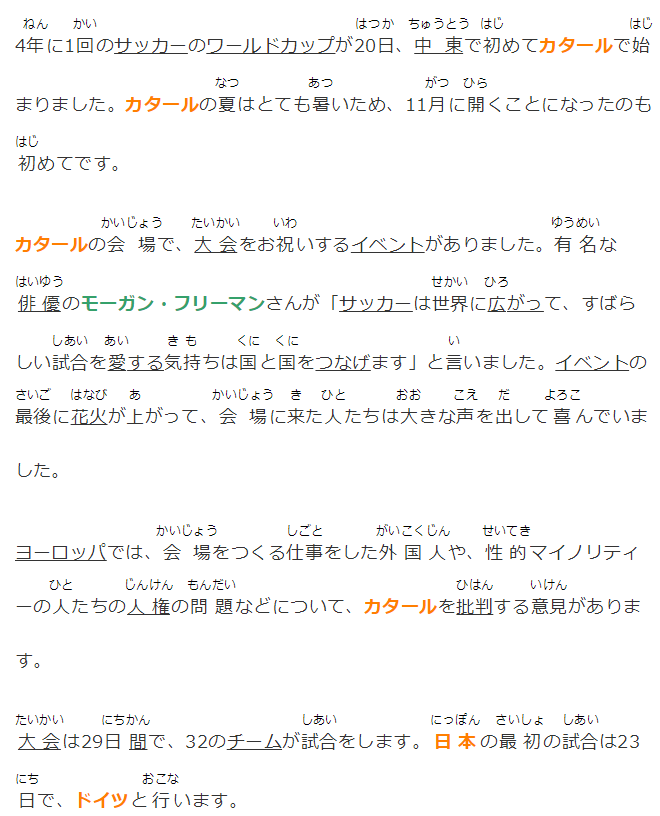 4年に1回のサッカーのワールドカップが20日、中東で初めてカタールで始まりました。カタールの夏はとても暑いため、11月に開くことになったのも初めてです。