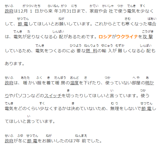 政府は12月1日から来年3月31日まで、家庭や会社で使う電気を少なくして、節電してほしいとお願いしています。これからとても寒くなった場合は、電気が足りなくなる心配があるためです。ロシアがウクライナを攻撃しているため、電気をつくるのに必要な燃料の輸入が難しくなる心配もあります。