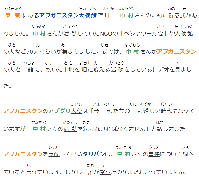 また、アフガニスタンのアブダリ駐日大使は「中村さんはアフガニスタンが最も困難なときにも一緒にいてくれましたが、今、私たちの国は同じくらい難しい時代にいて、彼が築き上げてきたものが損なわれています。私たちにとって英雄であり、彼の遺志を継ぎ守っていかなければならない」と話していました。