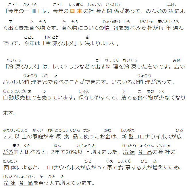 「今年の一皿」は、今年の日本の社会と関係があって、みんなの話によく出てきた食べ物です。食べ物についての情報を調べる会社が毎年選んでいて、今年は「冷凍グルメ」に決まりました。