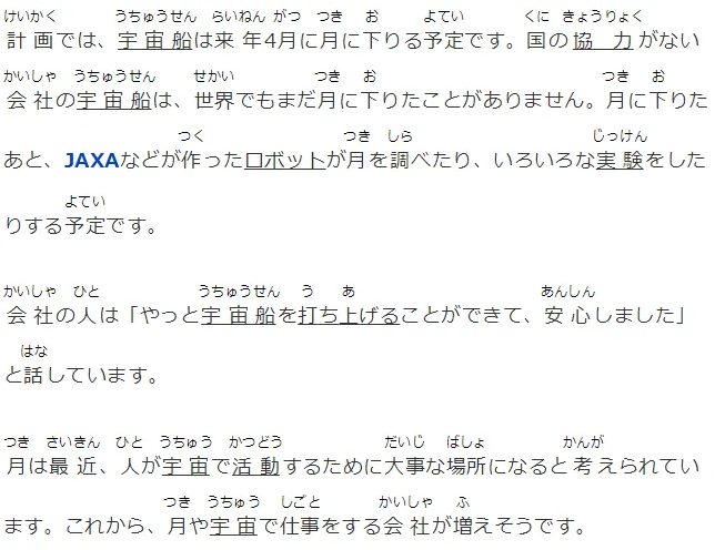 計画では、宇宙船は来年4月に月に下りる予定です。国の協力がない会社の宇宙船は、世界でもまだ月に下りたことがありません。月に下りたあと、JAXAなどが作ったロボットが月を調べたり、いろいろな実験をしたりする予定です。
