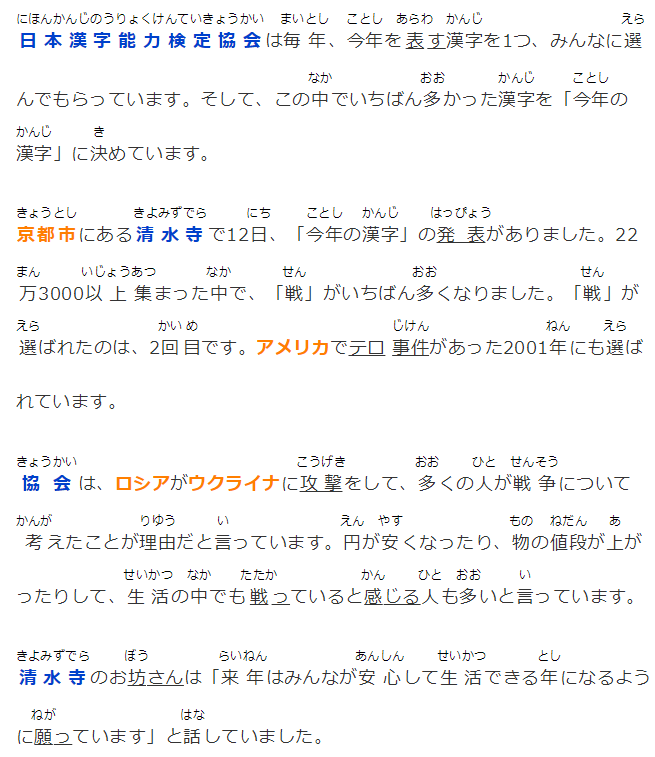 清水寺の森貫主は「『戦』が選ばれたのはロシアによるウクライナへの軍事侵攻が非常に強い印象を残したためだと思います。来年は皆が心安らかに日々をおくれるような年になるよう願っています」と話していました。