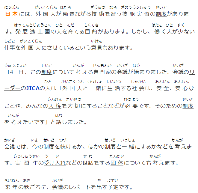 14日、この制度について考える専門家の会議が始まりました。会議のリーダーのJICAの人は「外国人と一緒に生活する社会は、安全、安心なことや、みんなの人権を大切にすることなどが必要です。そのための制度を考えたいです」と話しました。