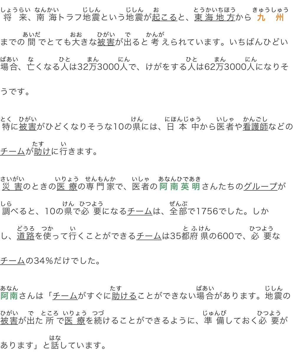 災害のときの医療の専門家で、医者の阿南英明さんたちのグループが調べると、10の県で必要になるチームは、全部で1756でした。しかし、道路を使って行くことができるチームは35都府県の600で、必要なチームの34%だけでした。