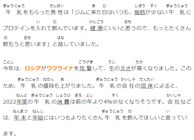 今年は、ロシアがウクライナを攻撃して、牛のえさが高くなりました。このため、牛乳の値段も上がりました。牛乳の会社の団体によると、2022年度の牛乳の消費は前の年より4%少なくなりそうです。会社などは、年末と年始にはいつもよりたくさん牛乳を飲んでほしいと言っています。