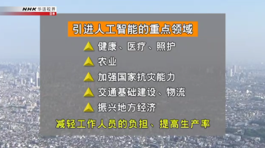 该战略还计划在2019财年构建“人工智能研发网络”,并设立核心重点研究项目,同时在包括健康、医疗、照护等5个重点领域引进人工智能,以减轻工作人员的负担并提高生产率。