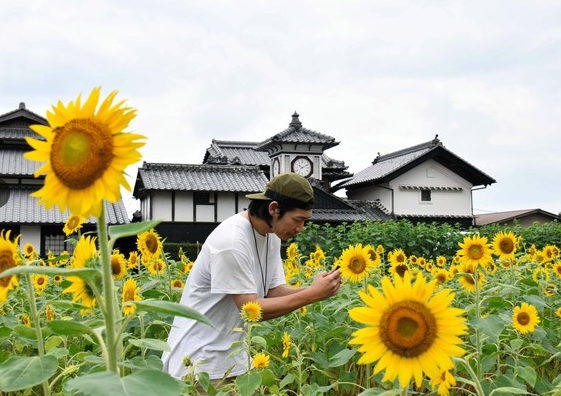 对此,特地从香川县丸龟市前来观赏向日葵的公司职员秋山泰辉表示:“这里的向日葵花朵特别大,钟的风景与花朵交织出的怀旧之感很美,获得了很多能量”而且还拍摄了很多照片。