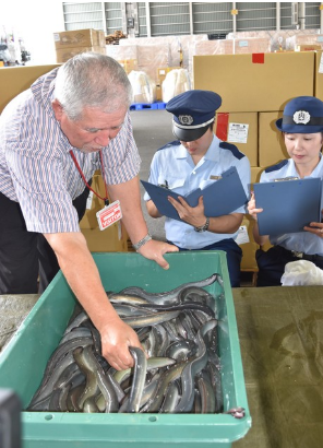 在7月27日的土用丑日(日文为:土用の丑の日)前夕,成田机场迎来了鳗鱼进口的高峰期。在机场的仓库里,来自中国大陆及台湾地区的鳗鱼接受了东京海关成田航空货物办事处工作人员的检验。