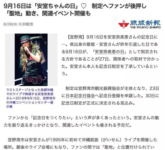 近日,冲绳县的宜野湾观光振兴协会已向一般社团法人“日本纪念日协会”提出申请,计划为已退出歌坛的歌手安室奈美惠设立纪念日,将其封麦日的9月16日设立为“安室奈美惠之日”。