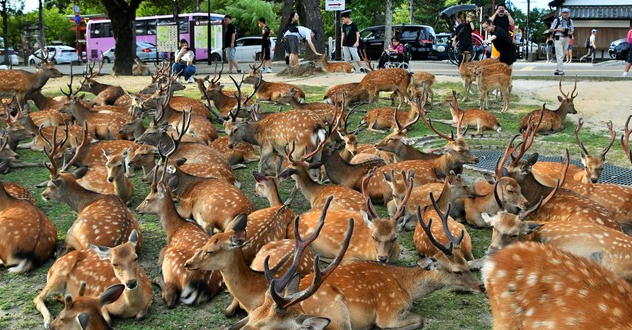 在持续酷暑的夏季,日本以小鹿而闻名的奈良市经常会出现大量的鹿聚集在一起的“小鹿开会”现象。最近,在奈良国立博物馆新馆前的换气口附近,有一百余头的鹿就栖息于此,似睡非睡。游客们为此驻足,纷纷举起相机拍照。