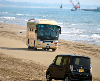 “千里滨沙滩兜风道”由于沙粒较细,在吸收海水后便会收缩,因此大型巴士也可以在上面行驶。但另一方面,因海流变化等影响,由于持续受到侵蚀,沙滩的宽度正在持续变窄。