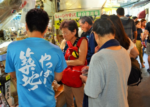 在筑地,场外市场林立着餐饮、鲜鱼、餐具类、刃具等约460家店铺。筑地市场搬迁之前,这里曾从早热闹到晚。现在,受益于英式橄榄球世界杯赛(Rugby World Cup)的影响,众多外国观光客正造访于此,乍一看,这里仿佛与以往并没有不同。然而,随着进货之余顺道过来的日本顾客减少,筑地场外市场的销售额已较上年同期减少了约2成,行人寥寥的状况也并不少见。因此各家店铺不会对这样的情况坐视不理。