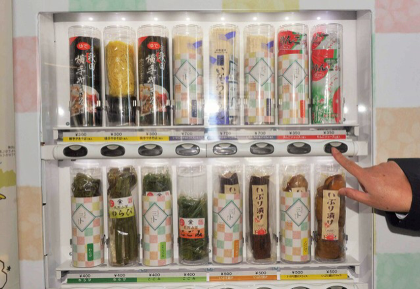 日前,一台贩卖日本秋田县横手市的特产横手炒面、白萝卜熏干后腌制的“Iburi咸菜(日文为:いぶり漬け)”、苹果汁等的自动贩卖机在横手站亮相。
