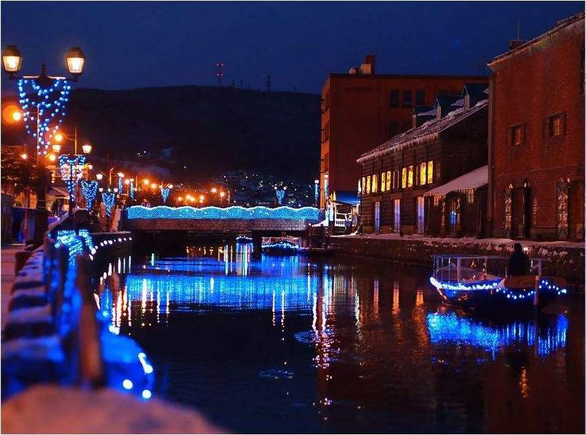 用一万盏蓝色LED灯装饰小樽运河两边的“青之运河”于本月1日,在日本北海道小樽市开始点亮。这是小樽市冬日观光活动“小樽雪物语”的重要内容之一,在活动期间,从小樽市的浅草桥到中央桥,每天晚上沿着运河两边的蓝色装饰灯都会点亮。