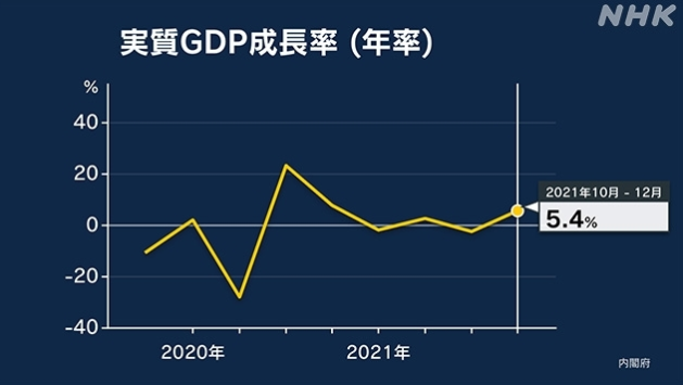 近日,日本内阁府公布了2021年10月至12月日本国内生产总值(GDP)的快报值。除去物价变动的GDP实际增长率环比增加1.3%,换算成年率为正5.4%,时隔1个季度转为正增长。